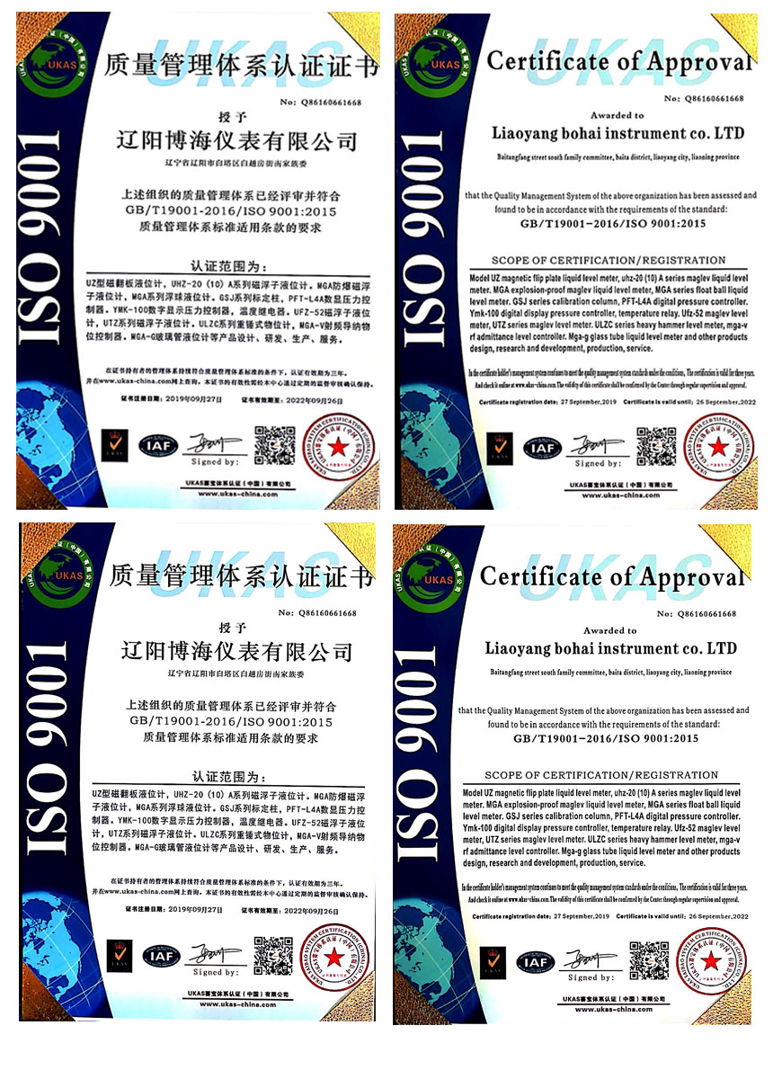 遼陽博海儀表有限公司(簡稱“博海儀表”)成立于2010年,位于遼寧省遼陽市占地面積約1500平方米。是一家專業(yè)生產(chǎn)銷售液位計、物位計的廠家。主要產(chǎn)品有:磁浮子等液位計、料位計、變送器等。公司目前旗下有員工36人,年產(chǎn)銷,年銷售收入近5000000元。